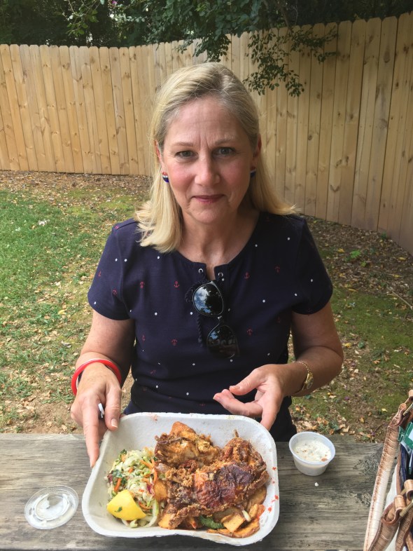 The Saltbox is a stand on the north side of downtown with picnic tables outside. Ricki Moore, the owner, man’s the window and the daily changing menu is written on a chalk board outside. We arrived just after noon, as Ricki was erasing the scallop burger as either a roll or platter choice. No worries for us since soft shell crabs were still available as was catfish, tuna and some other small fish that was bone in, so I didn’t consider it.