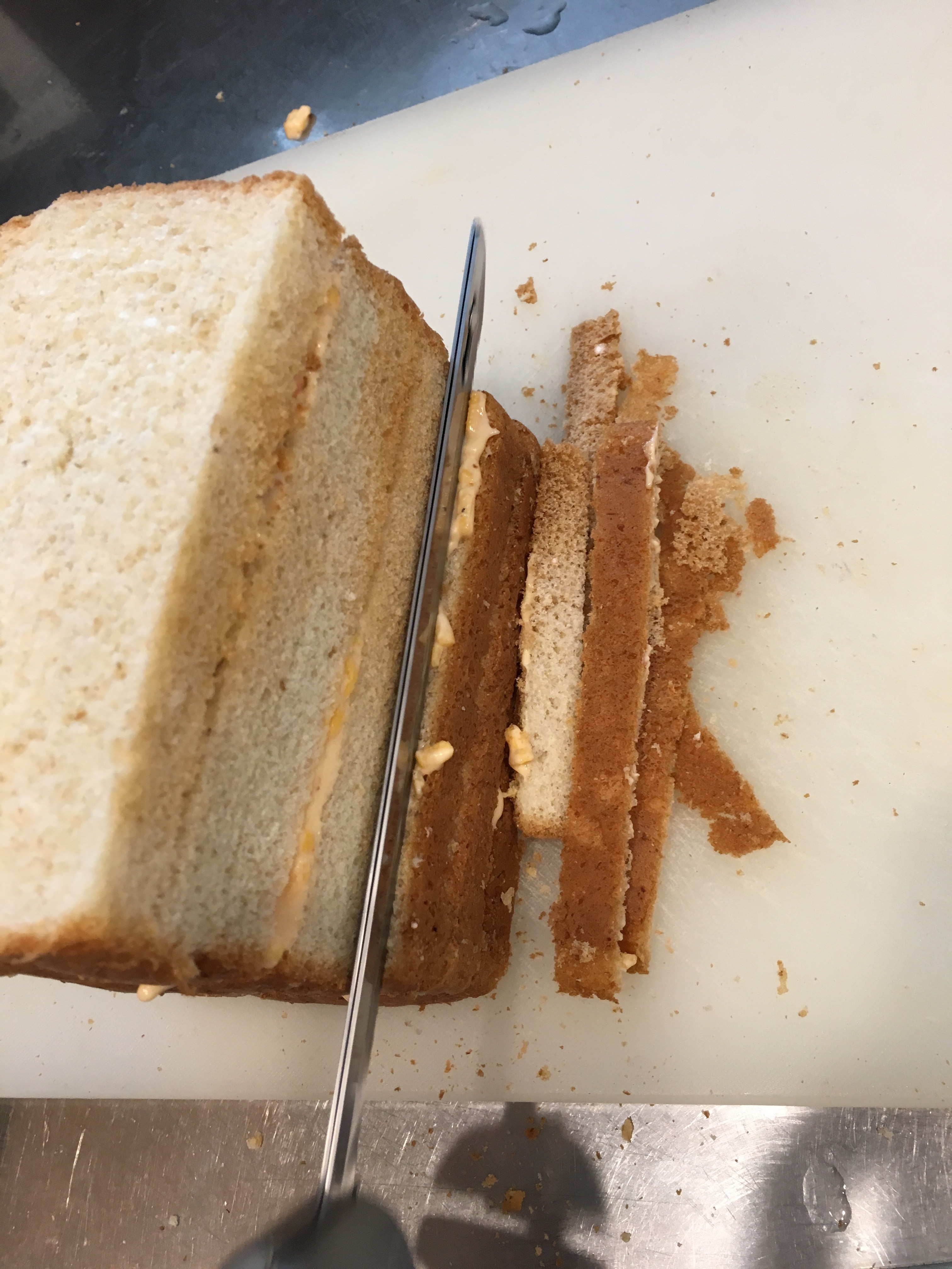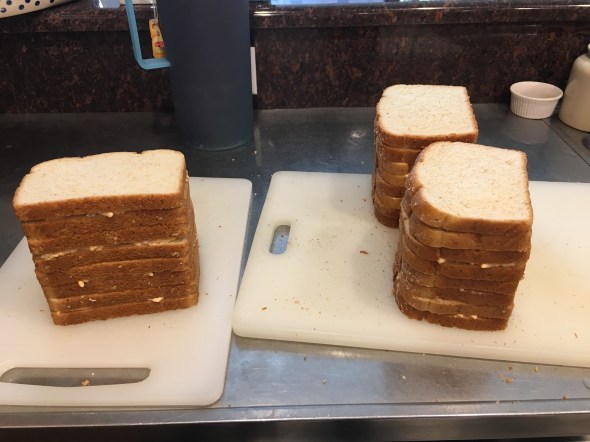 Here is the secret. Make a whole pile of sandwiches and stack them up on top of each other is the same order the bread came out of the bag. Gently hold the top and carve down the side barley shaving off the crust. Usually three sides of the bread are even from the pan they were baked in, but the top can be wavy. Try and sacrifice as little of the bread and filling when cutting that side as you can.