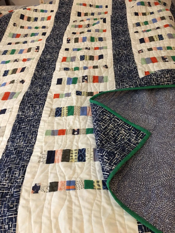 I went to meet her and knew this was going to be the beginning of a perfect friendship. Last week I picked up my quilt from her. The quilting that I had envisioned and described to her was exactly the modern look I wanted for this project. I brought the quilt home to finish it by hand sewing on the binding that covers the edge of the quilt. That was the slowest part of this project, but I was so excited to get my first quilt done that I kept at all 387 inches.
