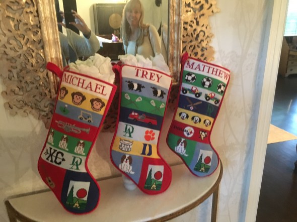 With all that is ugly in the country and the world this is a story of love and happiness. Yesterday I had the privilege to deliver three needlepoint stockings that my friend Christy that she designed and stitched for her sons. She wanted to make them new Christmas stockings that were personal to each of them, but were coordinated to go together.