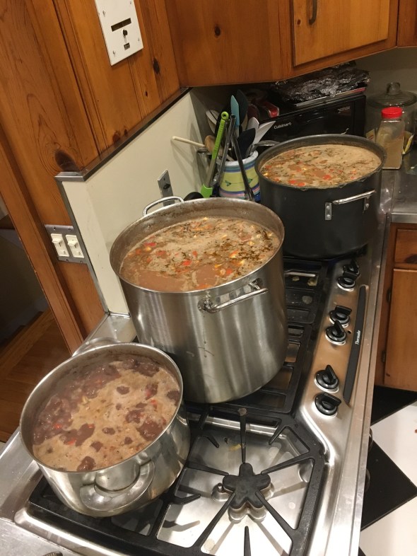 After my poor bridge showing I decided that I needed to be productive at something I am good at so at 4:40 in the afternoon I started making 52 quarts of black bean soup. Ending the day with a win in the kitchen took my mind off the things I was not so good at. It worked for the four hours I was cooking, but now I am exhausted, but not really able to rest.