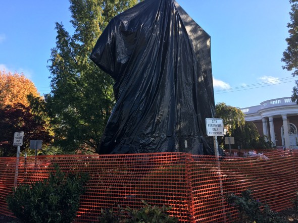 Posted: October 24, 2017 Filed under: Uncategorized Leave a commentThis morning my family gathered at the Hill and Wood funeral home in downtown Charlottesville right across the street from Emancipation Park, sight of the Robert E. Lee statue where lots of ugliness broke out this summer. My cousin Mary and I got there early and walked around the park one small square big. A group of preschool children holding on to a rope traversed in front of the statue, now draped in black plastic so as not to draw any attention to itself, without batting an eye. A number of homeless men lay on the grass of the square and no one seemed to pay a bit of attention to the mass under plastic as if it does not even exist any more.