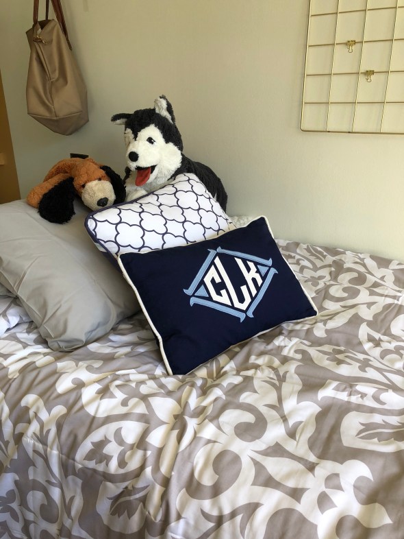 After the unpacking of all that we already had, we made a return trip to Target to finish getting the baskets, lights and trash cans we forgot yesterday. Carter and Olivia both were very excited about creating the perfect nest. The only draw back to the room was the butterscotch colored wall where the closets and door are. I am never sure who picks these colors out or if they are paint company seconds that Universities get for cheep.