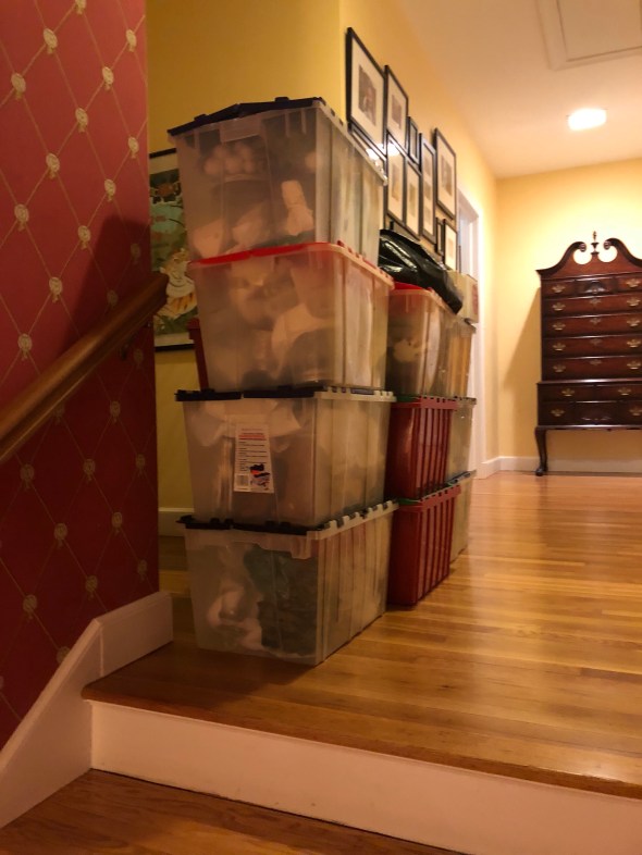 I had only been gone one night, but it felt like a week. Since today ended up being a snow day in Durham and I had nothing on my calendar anyway, since I wasn’t supposed to be here, I decided I would make the most of it and take the Christmas down alone. This meant that I went to the attic and retrieved the 20 crates for all the non-tree ornaments that I put up. If I had put the tree up there would be no way I could do this alone.