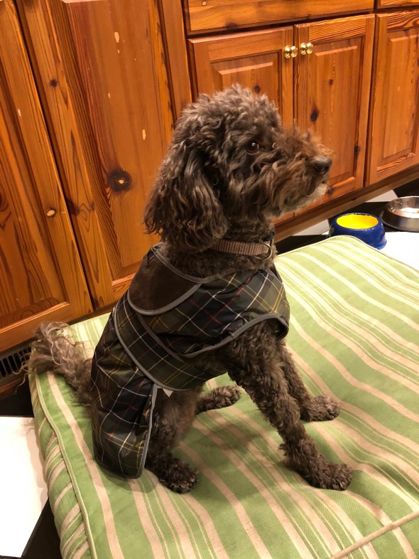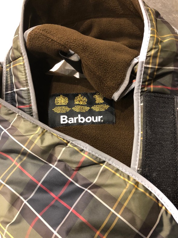 I am sure we could have gone to the local Pet store and gotten her a sweater or inexpensive fleece jacket, but that was not what Carter thought she deserved. Wanting both a fleece on the inside and waterproof jacket on the outside Carter determined that a Barbour jacket was exactly what our princes should sport.