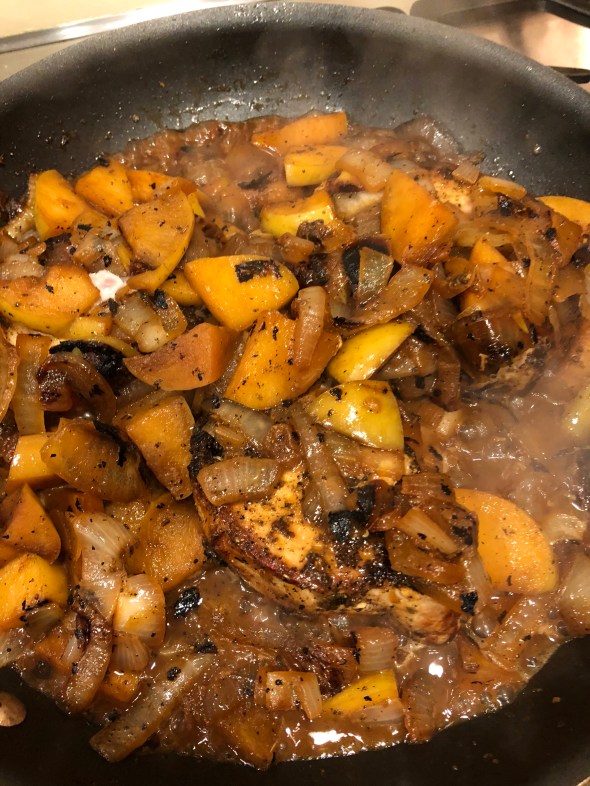 In the same pan turn the heat up to medium high, add the seasoned pork. Cook on one side until brown, flip and brown the other side. Add the apples and onions back in the pan. Add the cider a little more salt and sage. Bring to a boil and reduce to simmer. Add the butter. Cover and cook until the pork reaches 160°. How long depends on how thick the chops are, but it is not that long.