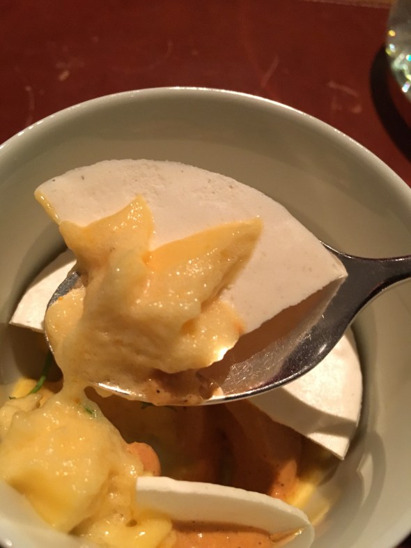 The next item was Brussels Sprouts that had been lightly cooked and hollowed out and stuffed with Brussels spout purée, mashed banana, stock of kaffir lime leaves, smoked oil, coriander and wild peanut. Who knew mashed bananas go so well with Brussels sprouts.