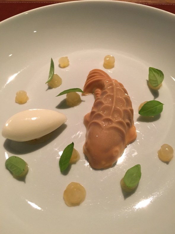 An Ikarimi Salmon followed. And those light look like cherry tomatoes next to the fish, but they were round tomato like balls. Oil confined ikarimi salmon filet, buttered stock of tomato juice and marukan rice vinegar, compote of tomato and Star anis and green anis.