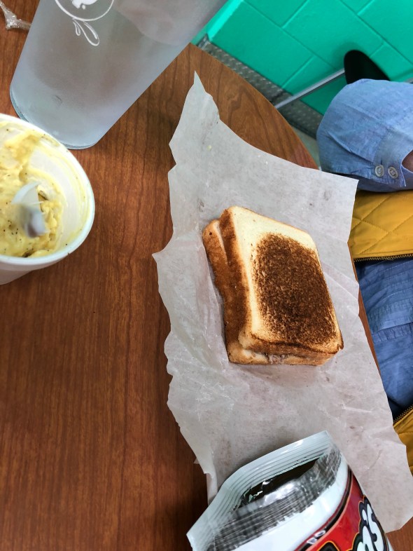 We all ordered the same sandwich from the choice of five, going with the pork barbecue for $2.75. We splurged and went for the potato salad for a buck which is clearly where Starnes is making their profit margin, but that tiny cup of potato salad was good. In less than the shake of a possum’s tail our server was back with a toasted sandwich wrapped in wax paper with just the right amount of pork and a smear of well chopped slaw on top. At Jan’s suggestion I added a few drops of the sauce that was in the squeeze bottle on the table.