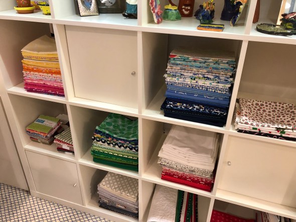 It is a wintery cold January like day here and Russ, with a sinus headache taking a nap, I had no guilt about locking myself in my sweat shop watching a Netflix series “Escape to the Country,” folding and sorting fabric. It was like a scene out of “Romy and Michelle’s high school reunion” where they are folding scarves, but with English accents.