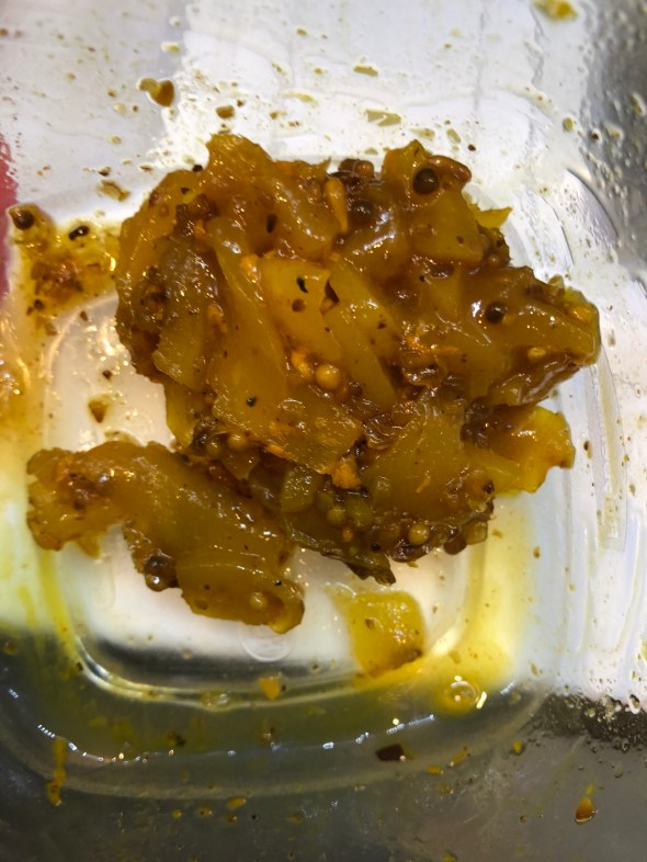 The next day toast the mustard seeds in a dry fry pan for 15 seconds. Add the other spices and the mangos. Stir on medium heat. Add the other ingredients and stir