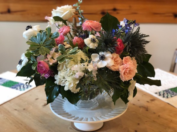 While I was needlepointing the doorbell rang and my friend Stacey w standing at the door with this beautiful arrangement she had made. Stacey recently opened Figtree design florists and has filled the void that the closing of Family Garden left in Russ Lange’s life.