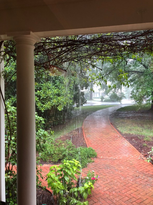 Russ and I brought her up to our bed, which is her home base and she is still afraid, but less so. I am going to have to pay closer attention to her and not think she is interested in sewing the next time she comes and sits on my feet. Poor girl, I can’t stop the rain, only hug her.