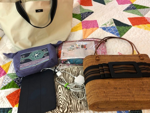 I am not that woman. I fear they will make me check something I absolutely do not want to put in the bottom of a plane. So I have perfected the packing of my personal item. It is a Scout bag with a zipper that I put a small purse in, and three bags each dedicated to a different subject; a needlepoint bag, an electronics bag and an art/journal bag. Inside my purse are also even smaller specialized bags. Nothing is lose, not even a pen.