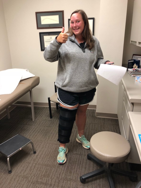 Dr. Silver came in and checked Carter out. He told her his daughter was at her camp and asked if Carter had met her yet. Since he was well aware of the mountain terrain at camp he put Carter is a giant foam knee brace. Thankfully no surgery or anything else worse is required.