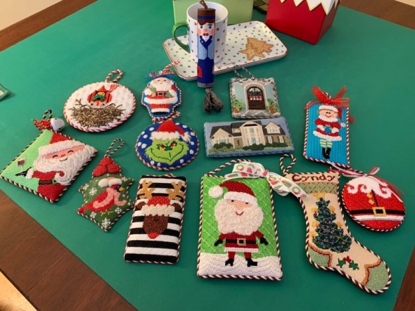 I wait all year for Needlepoint Christmas. My stitching table advisors gather once a year and exchange ornaments we made for one friend whose name we drew in January. It is so fun to see what special things we make for each other.