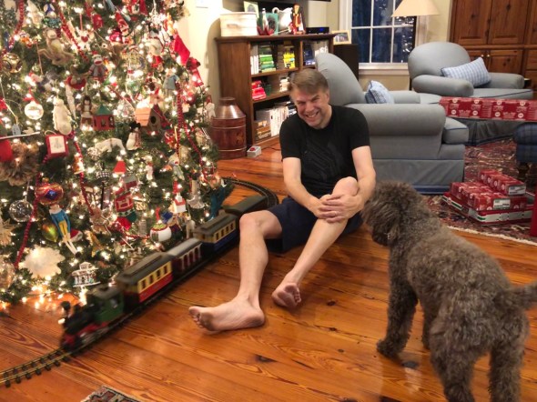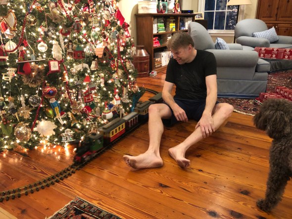 Russ has always loved trains. He introduced me to G-scale trains before we got married. They are big and also are called garden trains because they can be set up outside in your garden. When we first got married we got this train set thinking we would create a garden train. Life and deer got in the way. Now it just gets set up around the Christmas tree.