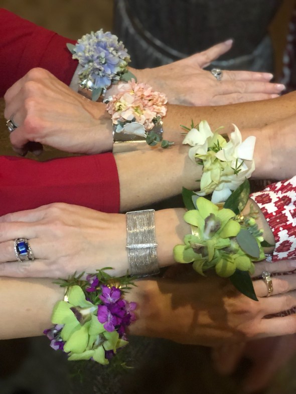 At least last night I had a lovely surprise from my sweet friend Stacey. We had a party to go to up at the club and Stacey, who has a beautiful flower business called Fig Tree Designs, made flower cuffs for all the ladies at our table. It was just a great surprise to sit down and be handed a corsage box with the darling blue flower cuff.
