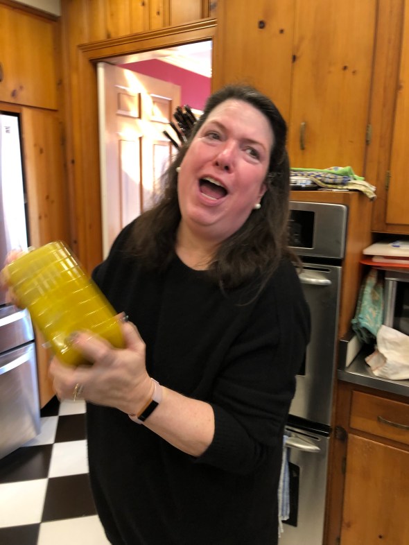 Second, he is juicing the limes for me since I am making Chili lime glazed salmon for lunch. It was a recipe I developed for a long ago Garden Club Christmas and it was a hit, so we are reprieving it. With my allergy to citrus the only way I can make it is if Russ touches the limes for me. He multi-tasked with texting a co-worker, while listening to a podcast, while juicing the limes.