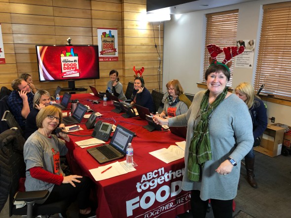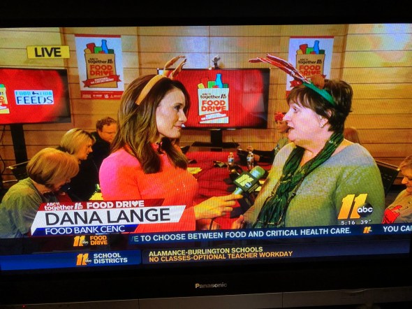 After a little rest I was off to downtown to ABC-11 where I appeared on TV for the food Bank Food Drive. The goal was to get those phones ringing with donors and we did. The Anchor Amber and I wore crazy holiday headbands until all the phones were ringing. Thanks to all the donors it only took a minute.