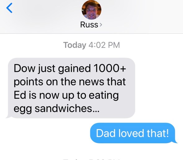 Russ texted me a message just after four this afternoon, which I read to my Dad. “Dow just gained 1000+ points on the news that Ed is now up to eating egg sandwiches…”. My father roared his big laugh. Happy about both the food and the market.
