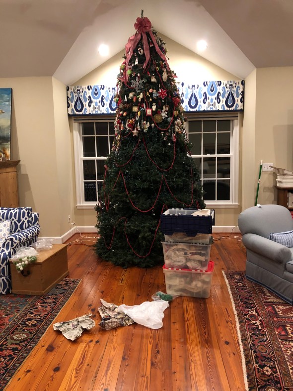 Between the eruption and no food for me all day I was a little tired. I stopped and picked up dry cleaning and came home to begin ornament removal from the tree. I got half done and only broke one ornament. I consider that success.