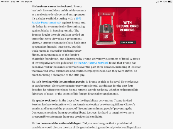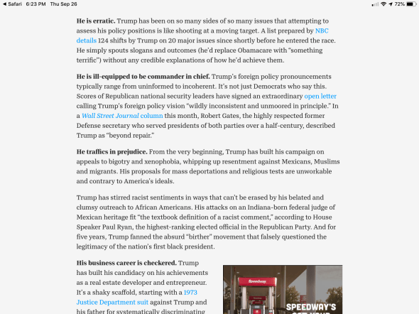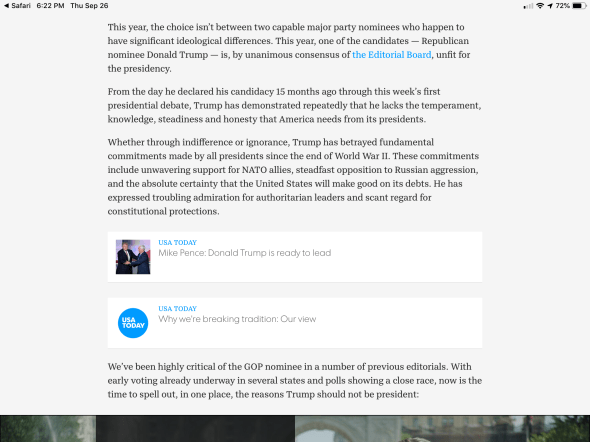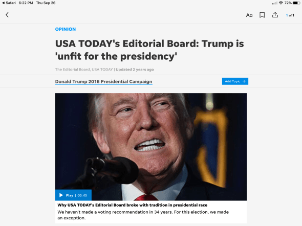 Posted: September 26, 2019 Filed under: Uncategorized Leave a commentRecently a friend of mine drew my attention to an editorial board opinion in USA Today from September of 2016. It was a historic moment for the normally vanilla, middle of the road, we don’t want to offend anyone, publication. Never is the 34 year history of the newspaper had they made a voting recommendation. They broke their own rule of bipartisanship and laid out the argument why people should not vote for Trump.
