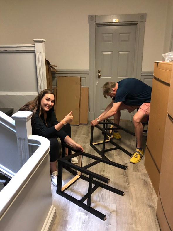 Thankfully the front door of the building was open due to all the moving in and moving out so we had the boxes carried up the flight of stairs to the hallway outside her door. Since we had no where to sit Russ started putting together the chairs from Carter’s new table and chair set. Thankfully Carter only had to go down the block to get her key so she went around 10:30 and was second in line.