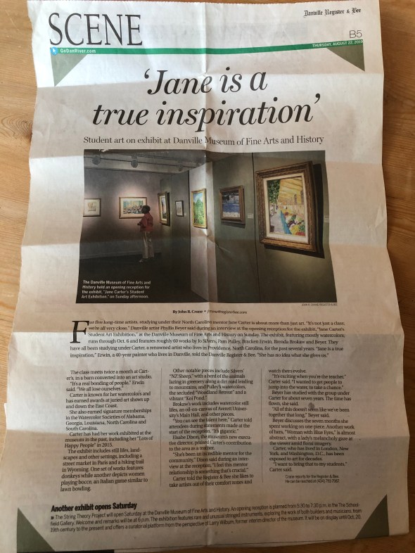 Today I got an envelope in the mail with just one thing in it, a folded up page from the Danville Bee newspaper. It was a front page story about an art show of my mother’s students at the Danville Museum. No note was included. She was “showing” me what she had been “telling” me all these years. Apparently my mom is a great art teacher.