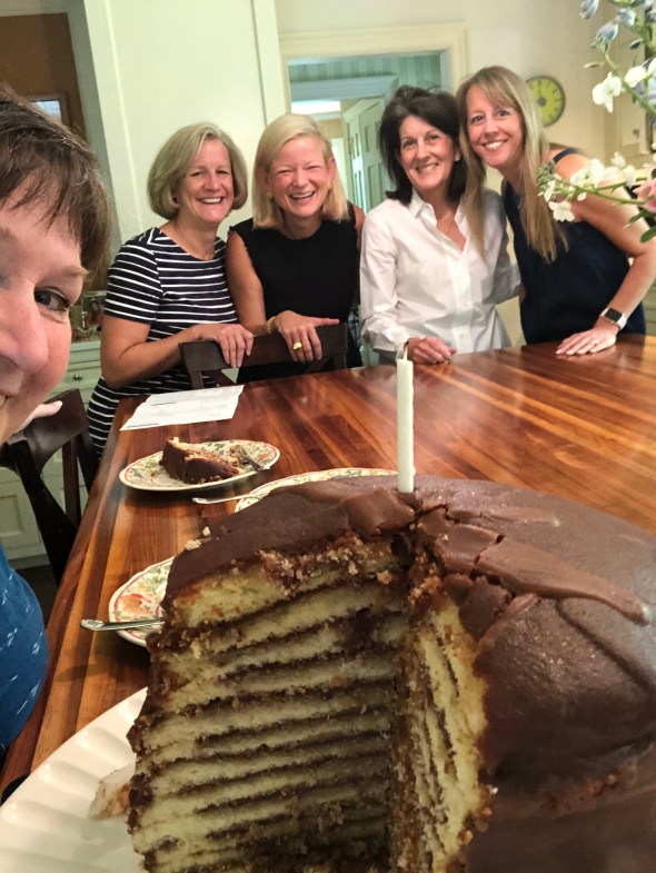 My Monday monthly Needlepoint group takes the summer off because two of our members spend the summer in the mountains. Today was our first fall get together and it happened to be Karen’s birthday month. This means we have cake at Needlepoint in lieu of eating lunch. Isn’t that the perfect way to justify cake.