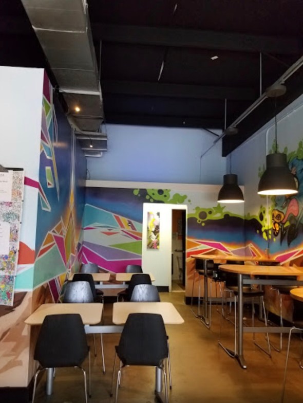 The small as you can possibly rent property is painted in brightly colored graffiti giving the place a hipper than the normal hole in the wall look. The menu of Bahn Mi sandwiches of a dozen variety and bowls is on the wall above the one station ordering cash register. There are about ten tables inside that are almost full as well as the outside.
