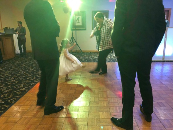 Then we were invited into the ball room for dinner and dancing. This is where JoJo, as the three year old flower girl, stole the show and danced all night. If it weren’t for JoJo I am not sure people would have filled the dance floor as much. I was thrilled to get to sit with my cousins JIm and Steve and Steve’s new wife Amanda. The completed the full circle of my first cousins on my mother’s side.