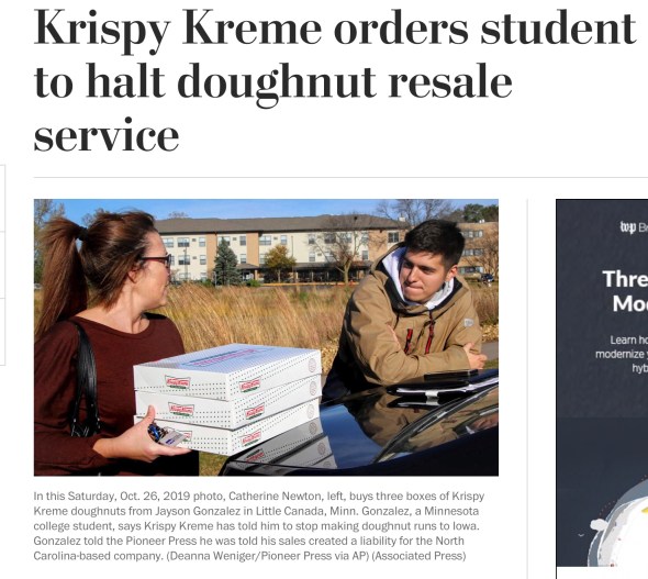Krispy Kreme caught wind of the entrepreneurial young man and called him and told him to shut down what in essence was his donut delivery service.