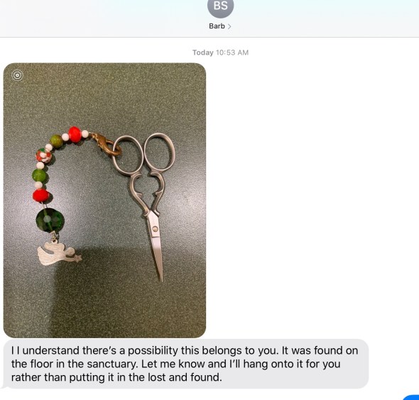 It’s a good thing to be known for sitting in the same place. Apparently this past Sunday I left my needlepoint scissors in our pew. Someone found them today and gave them to our receptionist. She texted me with a photo of them asking if they were mine.