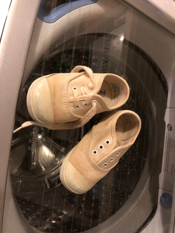 I looked in my laundry cabinet above the washer for the tiny pair of sneakers I have just for this job. The little white Keds were Carter’s first sneakers and they are the perfect thing to put in the dryer with the pillows. Three drying cycles and the pillows are fluffy, yet I feel the feathers may be still slightly clumped together so the banging of the little sneakers in the dryer continues. I really am getting my money’s worth out of those twenty year old tenny pumps.