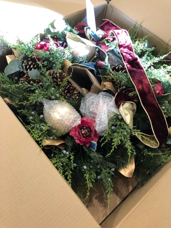 I thought it was too big to be anthrax and had no signs of being a pipe bomb so I bought it inside and opened it up. Inside was a giant fancy wreath. I looked for a card and could not find one. I opened the plastic envelope attached to the outside of the box and there was a return label and instructions to return it, but no invoice or gift card. So this is a total mystery.