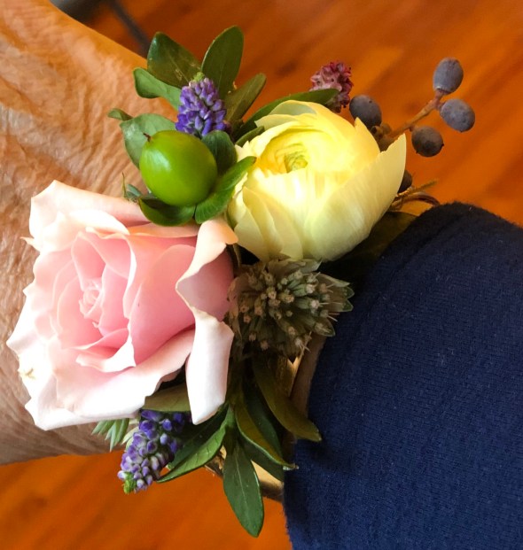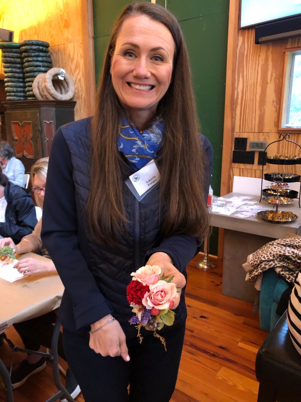 Then we had our meeting. It was held at Stacey Burkert’s floral workshop behind her house. It is like one big flower play land. She taught us how to make wrist corsages. I am not in need of many corsages these days, but making them was a very fun event.