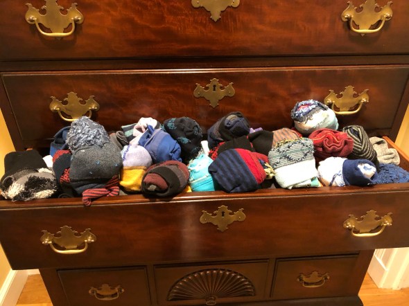 After doing my matching-clean-socks chore I went to put Russ’ socks in his sock drawer. Russ is very particular about socks, mainly because with size 14 shoes, well fitting socks can be hard to find. He used to only wear a Allen Edmunds socks, an expensive and conservative choice, but they fit.