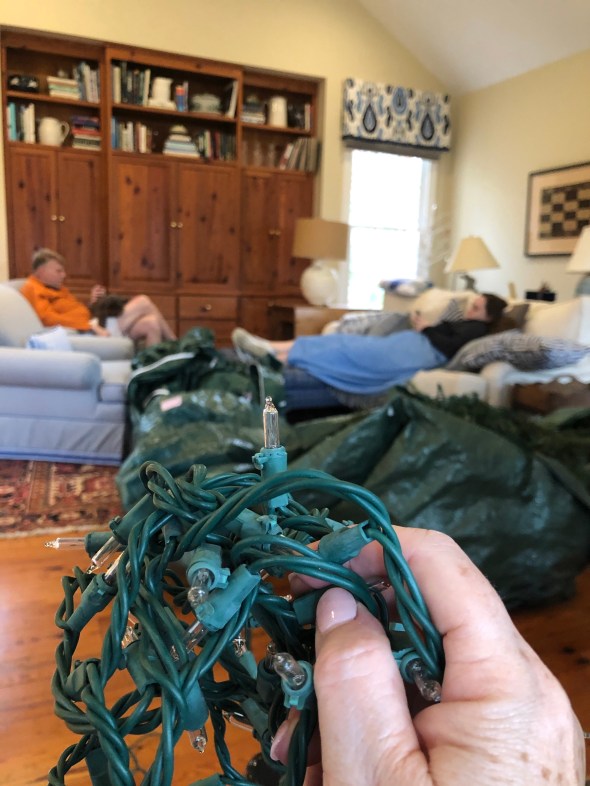 Russ and Carter wish that my light Hunt to fix the lights was faster because they can’t move on to the next section on the tree until I have lit the last section. They were really good eggs this year just chilling while I untangled and restrung.