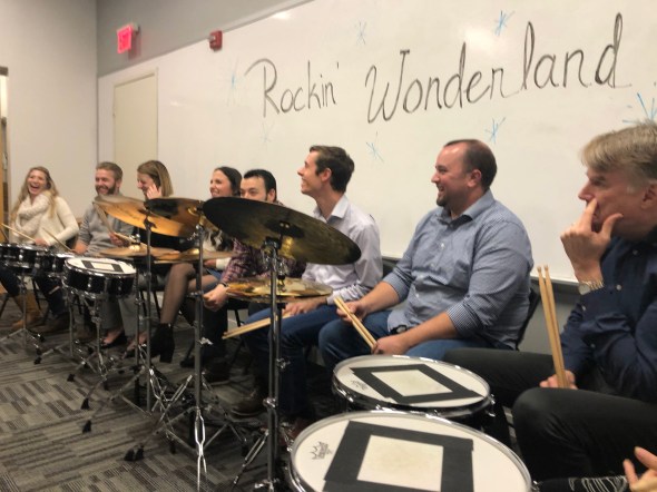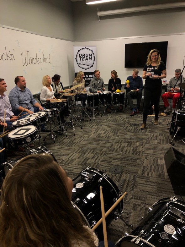 Tonight I went to Russ’ company Christmas party. Russ did not tell me it was going to be an activity party and I thought I was just going to eat a few hors d’oeuvre and come home. When I got to his office all the young ‘ins were standing around the company bar eating, but quickly we were ushered into the conference room where the room was filled with drums.