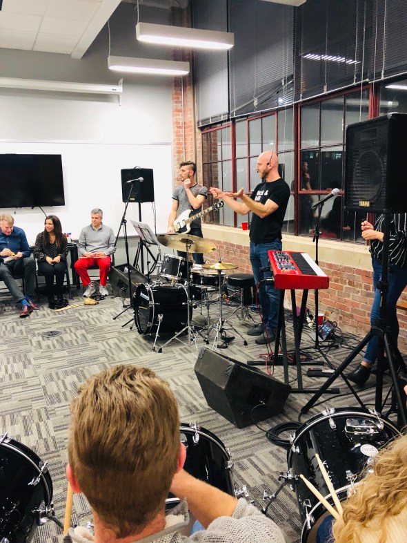 A group called Drum Team Collective was teaching us how to play drums. When we came into the room everyone just sat at random spots. Russ was not in a drum or symbol section. I think he might have thought he was getting out of it. Turns out he was in the tambourine, maracas, cow bell, shaker section. I was in symbols and was my normal trouble maker persona.