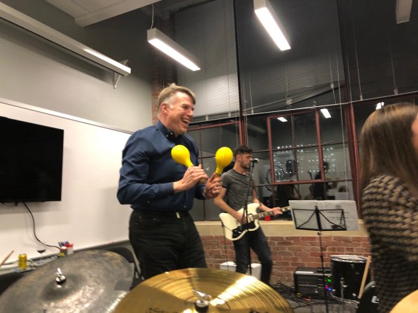 It was a very fun activity, although I wish I had worn the earplugs we were offered. The leader didn’t mind that I was a trouble maker and said that I would be fun to take on the road. He followed that comment up with you spend 90% of your time on the road driving some place and only ten percent playing music so you want people who are fun and the road and they don’t have to be the best musicians.
