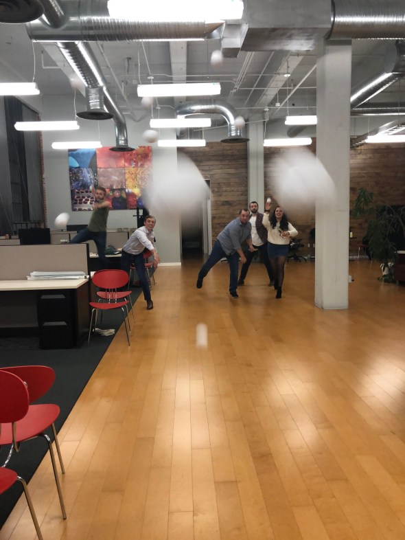 After the drumming activity we went back to the bar and had a big company indoor snowball fight. You can see how many snowballs were coming at me all at once!