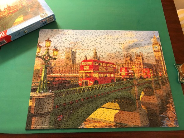 I got to spend the day not cooking, not wrapping, not decorating, but yes to puzzling. Russ got me a puzzle of the month present. I got to chose the size in terms of the number of pieces. He also got me a starter puzzle of London busses. It is only 500 pieces.