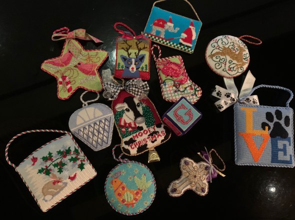 After we ordered our tea we exchanged our needlepointed ornaments. Each one was lovingly chosen for the receiver and generously stitched and finished. I cherish these gifts from these friends as only another stitcher understands what a huge gift a needlepoint ornament is. Sadly Ann Hannon was missing from our ranks because she couldn’t make it all the way from St. Louis so close to Thanksgiving. Her ornament, lovingly beaded was beautiful.
