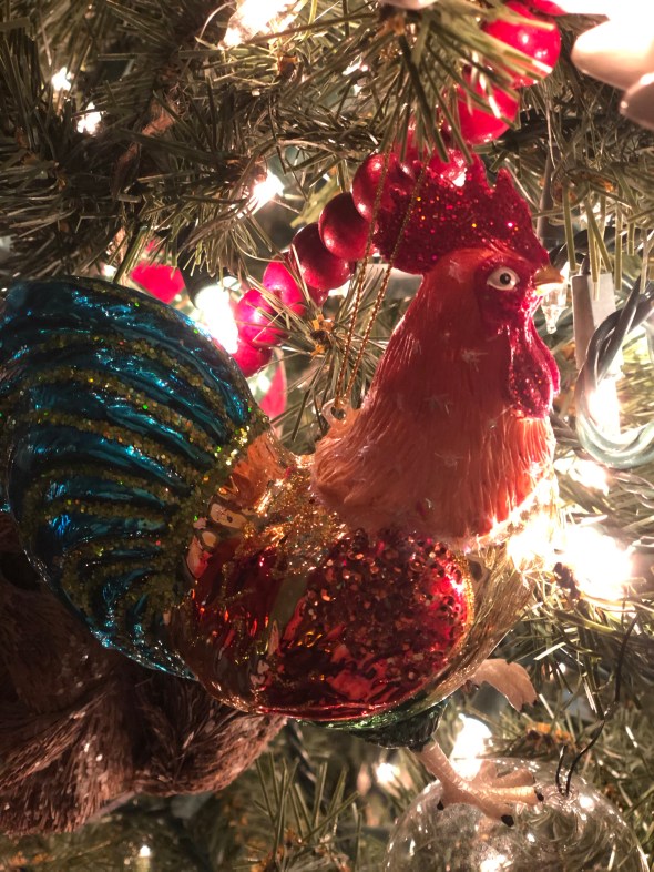 Given the “chicken” threat it came as quite a surprise when I was devastated when I broke a chicken ornament while standing on the ladder decorating last weekend. Russ and Carter acted appropriately sad for me, but I thought that was just for show. Not that losing one ornament could possibly be noticed on my jammed packed tree.
