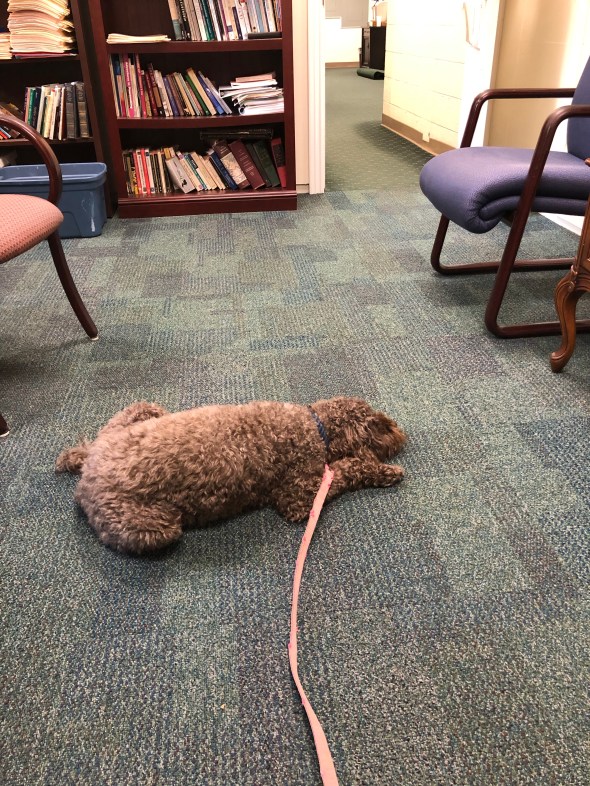 Today a bible study was going on in the parlor and Shay decided to join them for a while. Saundra Atkins was particularly happy to have her there. Shay roams the main floor of the mission center going from meeting to meeting spreading joy. Thank goodness Westminster is a dog friendly church since Shay is going about without me as I am in a meeting.