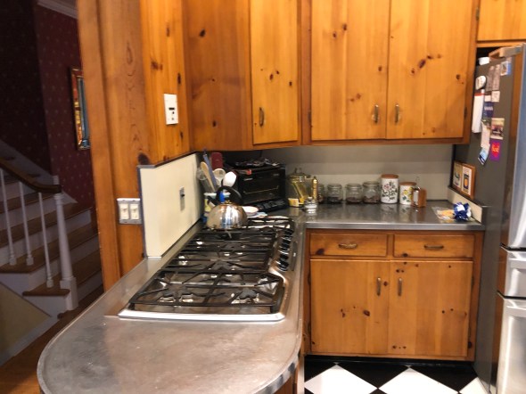 A year ago I decided I was going to paint my seventy year old knotty pine cabinets. This under taking was not taken lightly. I thought about it for years. I Love the layout of my kitchen and especially liked my seventy year old stainless steel counters. My appliances are great so I did not want to tear my whole kitchen up.