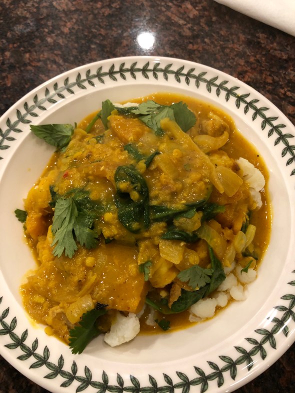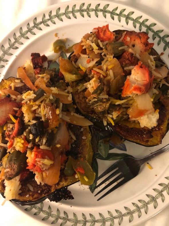 In a move to make the whole dinner more healthy as a leftover I cut up some of the Chicken Tikka and mixed it with the Bhindi Masala, which is an okra and tomato dish and sprinkled just a little rice with it. I heated it up and stuffed it into baked acorn squash halves. It was a yummy and healthy dinner.