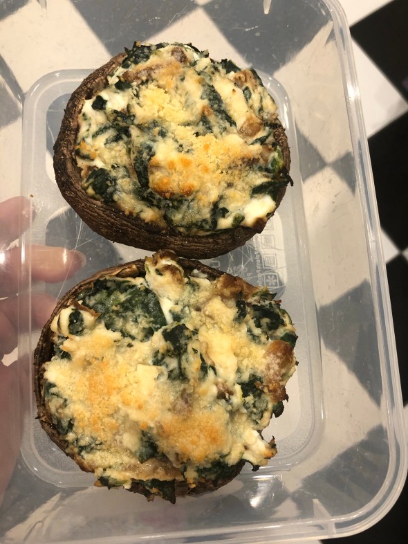 When mushroom caps are done drain any liquid out of them and then place back on cookie sheet gill side up again. Scoop one quarter of the spinach ricotta mixture onto the mushrooms and spread it out evenly. Repeat with other mushrooms. Sprinkle the Parmesan on top of the ricotta and spinach.